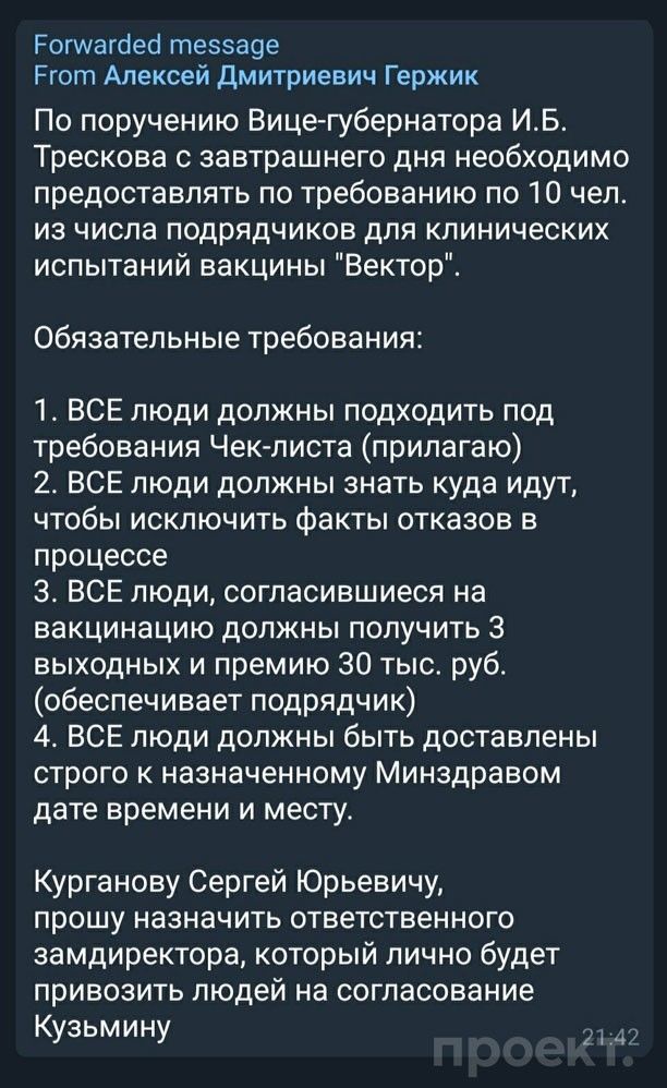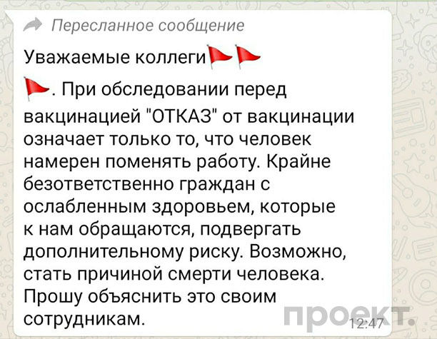 Деньги за участие в вакцинации предлагают далеко не всегда. Социальные работники Москвы рассказывают, что их обязывают соглашаться на прививку. «Руководство нам сказало, что если у нас нет справки [подтверждающей, что прививку от коронавируса нельзя делать], то мы обязаны сделать прививку. У нас паника в коллективе в организации, вакцинация должна быть добровольной, а нас заставляют, — рассказывает один из сотрудников центра занятости. Еще один социальный работник прислал «Проекту» сообщение, которое он также получил от руководства. В нем говорится, что отказ от вакцинации равносилен увольнению.