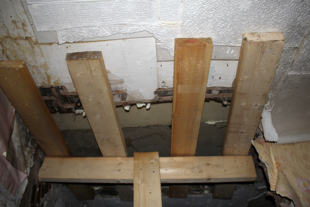 Бабушке из той муниципальной квартиры дали новое жилье. Но проблемы начались у жильцов сверху. Чтобы пол не провалился, МЧС пришлось ставить подпорные балки.