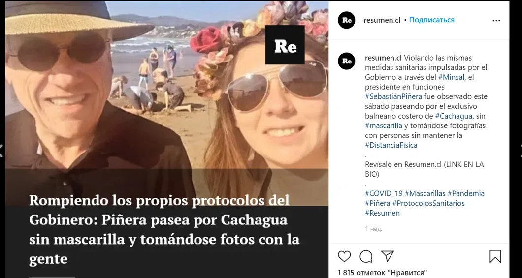 Ранее в соцсетях распространилась фотография главы Чили и незнакомой ему местной девушки на пляже, а также видео, как Пиньера гуляет по пляжу без маски. Девушка попросила его сделать совместный снимок, после чего опубликовала фотографию в соцсети. Как можно судить по фотографии, и президент, и местная жительница были без медицинских масок. Фото на пляже обошлось президенту в сумму, превышающую среднюю месячную зарплату в Чили.