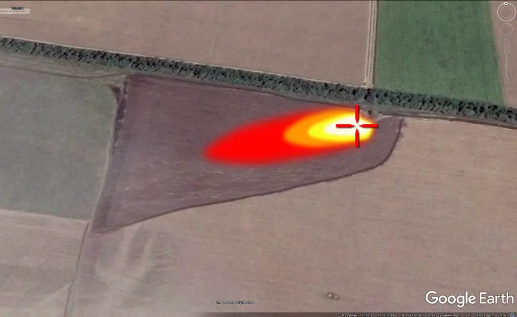 – форма и спектральные характеристики треугольного пятна на поле отличаются от «использовавшихся приемов земледелия на этом и окрестных полях» за последние 9 лет, и являются следствием перепахивания поля;