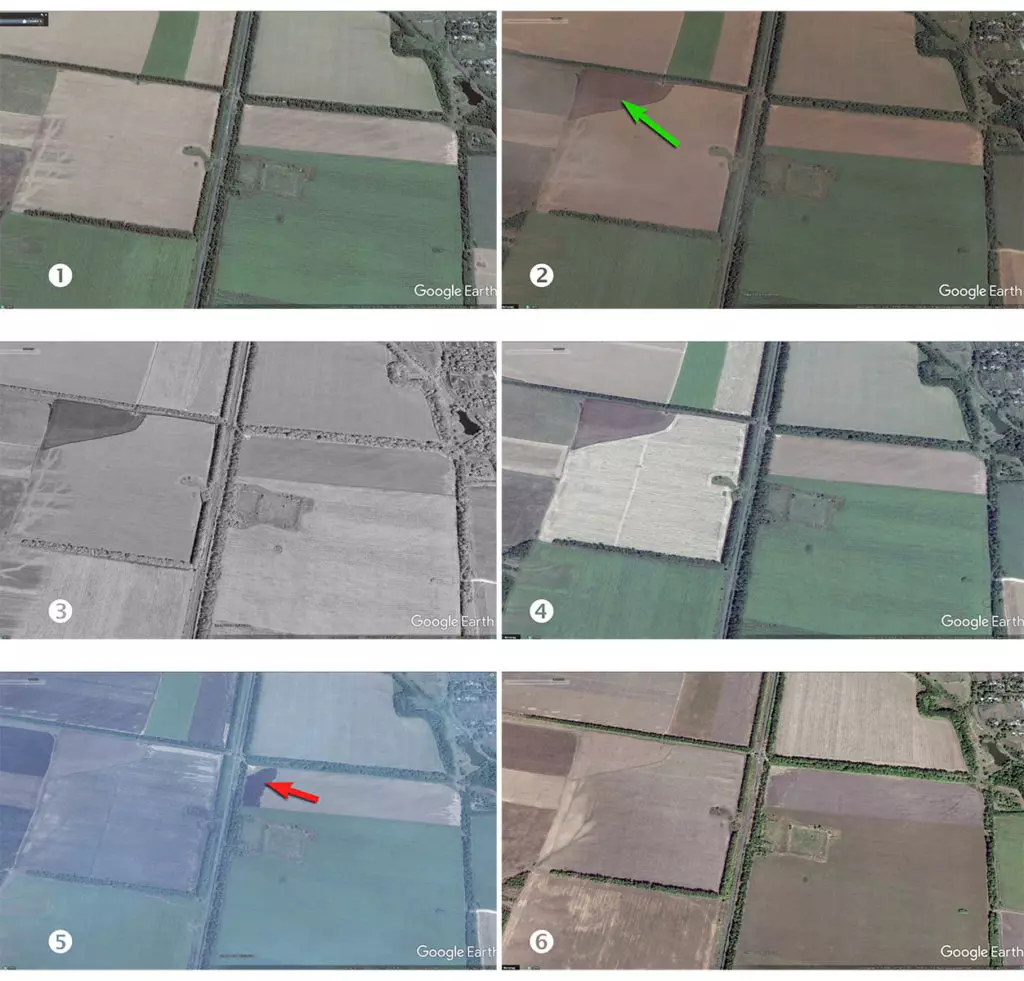 – во-вторых, на всех снимках отчетливо видно, что вспаханный треугольник отделен от всего поля бороздой или земляным валом – это может быть только защитным сооружением, препятствовавшим начавшемуся в углу поля пожару распространиться на остальную площадь поля. Это подтверждается тем, что на всех последующих снимках, вплоть до новой вспашки всего поля весной 2015 года, эта разграничительная борозда всегда отчетливо видна. В противоположность этому черное пятно на соседнем поле такой четкой границы не имеет и сливается с остальной площадью уже к середине сентября, после уборки урожая и окончания сельскохозяйственных работ.