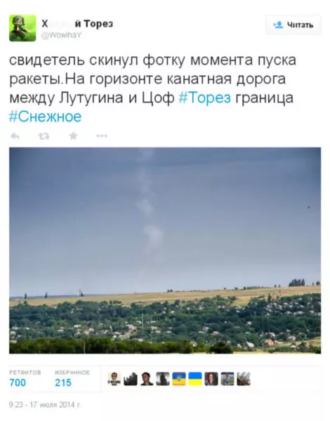 …17 июля 2014 года Павел Алейников, один из жителей дома №2 третьего микрорайона города Торез Донецкой области, примерно в 16:20 по местному времени услышал взрыв и выглянул в окно. Его взору на горизонте предстал уходящий в небо столб белого дыма, уже немного размытый ветром. Будучи заядлым фотографом-любителем, он всегда держал под рукой фотоаппарат, которым тут же сделал несколько снимков. Вот как впоследствии сам Павел рассказал об этом российскому журналисту Сергею Пархоменко: