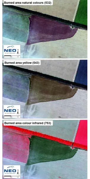 Вид зоны пожара (более темный горизонтальный эллипс внутри перепаханного треугольника) в разных участках спектра на снимке спутника WorldView-2