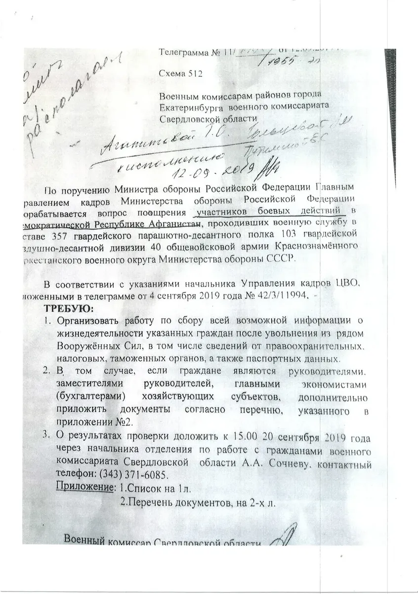 Важное обстоятельство: командиры, подававшие наградные документы в 1980–1981 годах живы, как и командир полка, их подписавший. По просьбе сотрудников Министерства обороны офицеры полка, в том числе Калинушкин, Романович и Пузычев, заверили у нотариуса свои показания по выписанным ими наградным документам. Но при составлении текста обращения к президенту они поначалу отказывались включать в список свои фамилии — им важнее было добиться справедливости для своих солдат, хотя бы сорок лет спустя. Рядовой Петр Магдалина привез из Екатеринбурга увесистый кофр с аккуратно подшитыми копиями заявлений, собранных в разных странах, и нотариальными документами. Когда весной 2019 года я вручал их заместителю министра, было очевидно, что на него такой подход к делу произвел впечатление.