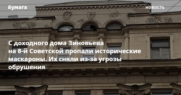 Петербуржцы заметили, что с доходного дома Зиновьева на 8-й Советской улице пропали исторические маскароны. В администрации Центрального района рассказали, что скульптуры сняли из-за угрозы обрушения, пишет Piter.tv.