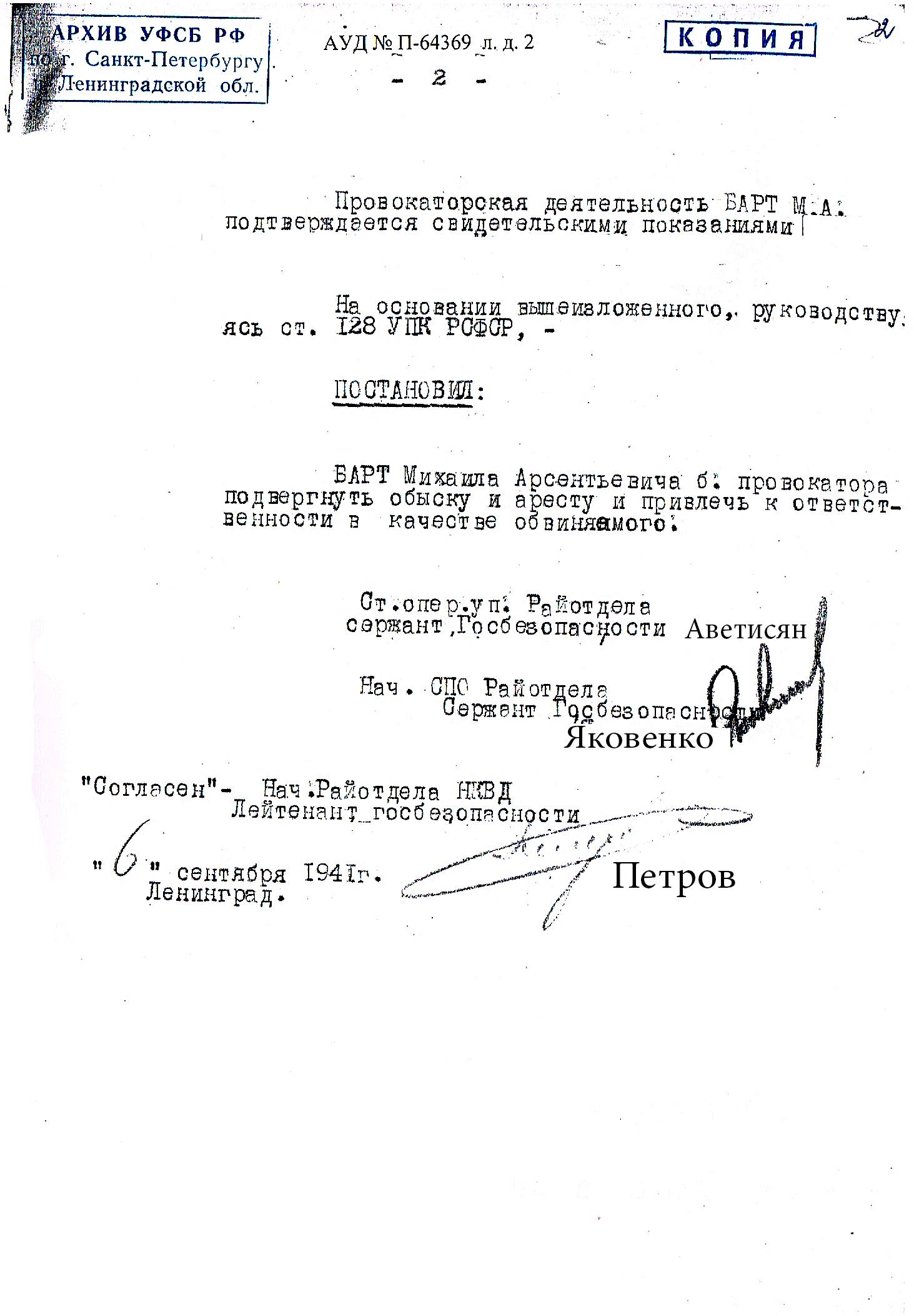 Выражение лица у него было соответствующее – видимо, он все понимал. Дальше была опись вещей, взятых при аресте. Обыск – понятые, домработница, все подробно. Его взяли 17 сентября 1941 года, блокада началась 8-го. Там был протокол единственного допроса от 21 сентября. Обвинили прадеда по статье 58.13, антисоветская пропаганда. И дальше я увидел документ, благодаря которому меня к делу допустили. Там была анкета, которую прадед заполнил собственной рукой, все графы – жена, родители, сестры – тут я очень много нового узнал о своей семье. В графе дети он написал: старший сын – Поповский Борис Михайлович, младший сын – Барт Леонид Михайлович. В том, что у его старшего сына была другая фамилия, странности не увидели, как мне объяснили, в то время многие меняли фамилии, было прямо поветрие такое. Ну, и тут – был человек Бартом, стал Поповским, ничего удивительного. И это было написано в деле рукой прадеда. Предварительно меня попросили принести свидетельство о рождении моей мамы, там видно, что она в девичестве была Поповской. То есть они все четко проследили, прежде чем меня к делу допустить. Прочитали мою историю, поехали в архив, нашли дело и увидели эту анкету.