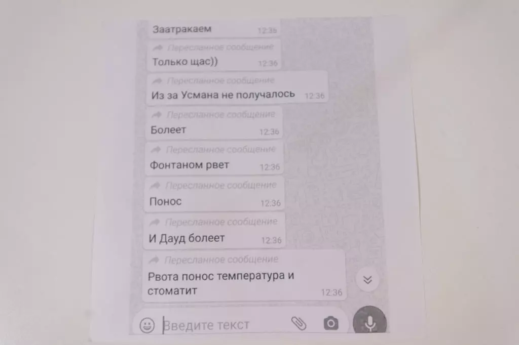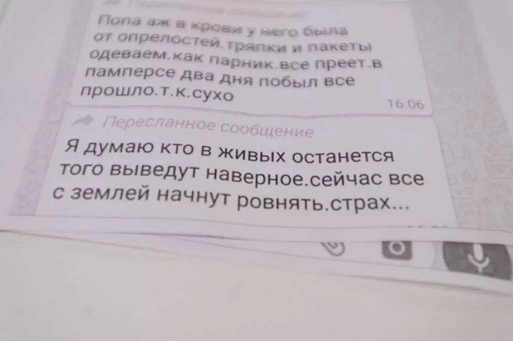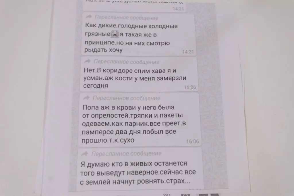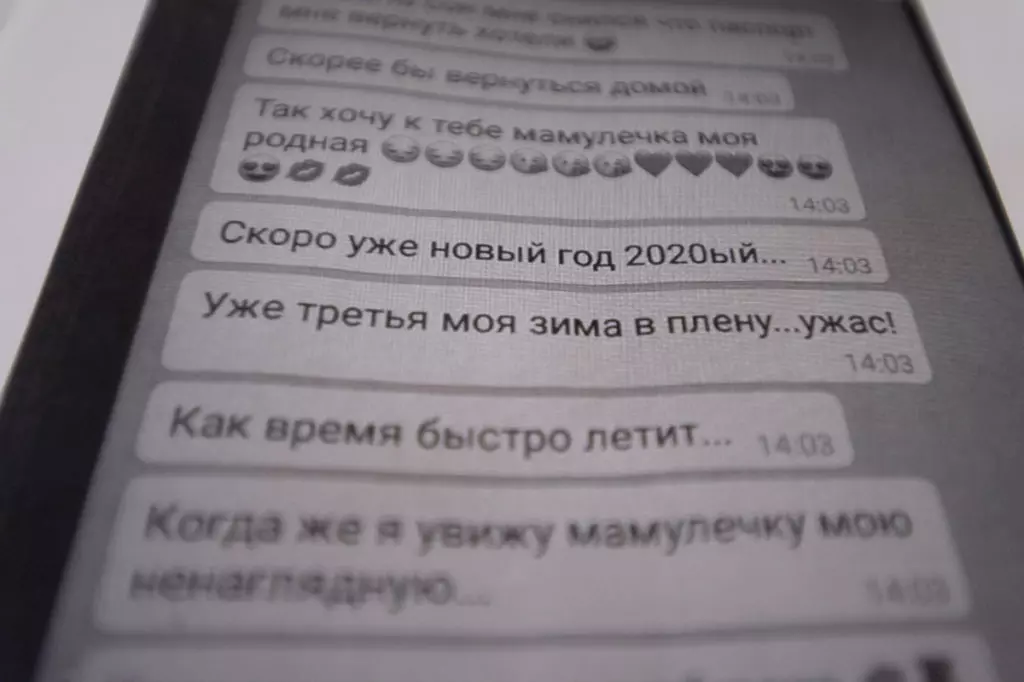 Зайнаб показывает скриншоты сообщений, которые пишут женщины своим матерям. Одна девушка пишет, что у нее температура и розовая мокрота. Другая — что ей приснился сон, будто вернули ее паспорт. Про третью зиму в плену. Про болезни детей — рвоту, понос, температуру, стоматит. В основном все пишут — мама, я тебя люблю и хочу вернуться домой.