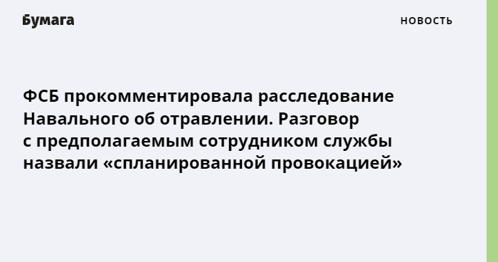 В частности, в ФСБ назвали «спланированной провокацией» видеоролик с телефонным разговором Навального и предполагаемого сотрудника ведомства, пишет ТАСС. По мнению ФСБ, ролик направлен на «дискредитацию ФСБ России и сотрудников органов Федеральной службы безопасности». В службе также считают, что осуществление «провокации» «не было бы возможным без организационной и технической поддержки иностранных спецслужб».