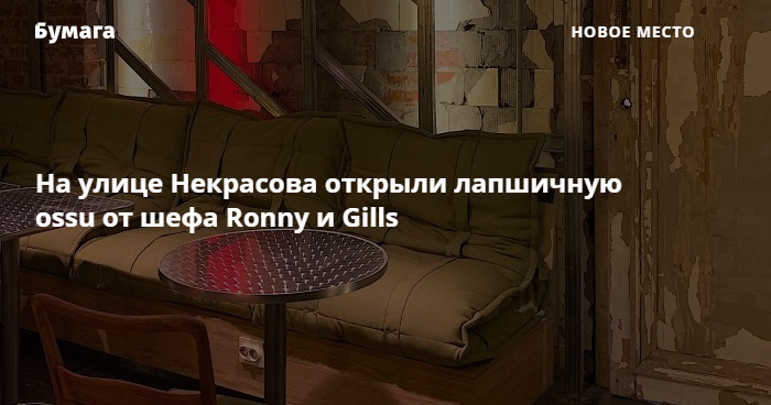 На улице Некрасова, 21 начала работу лапшичная ossu, сообщили «Бумаге» представители заведения. Проектом занимаются Дмитрий Кюлленен (шеф-повар Ronny и Gills) и Антон Кузнецов, собравший для проекта пивную карту — с классическими лагерами, элями, милкшейками и фруктовыми сауэрами.