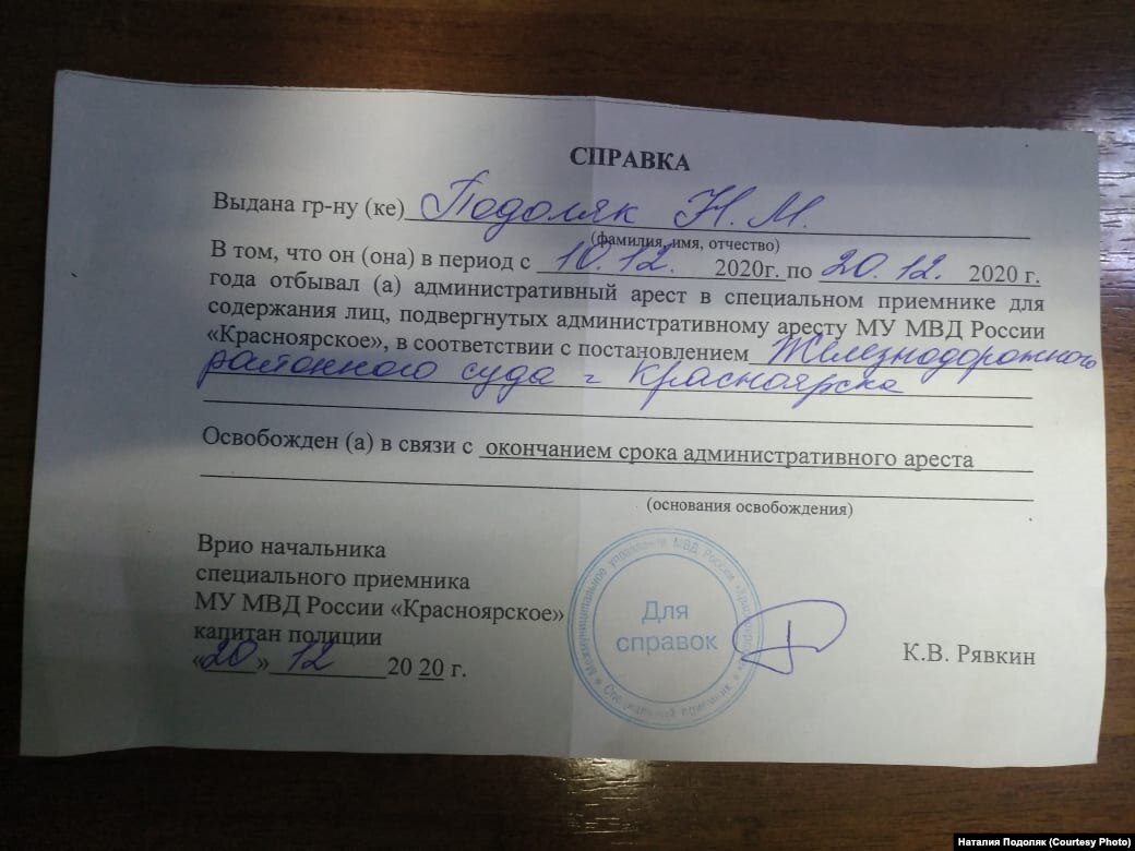 Наталья Подоляк стала известна после того, как в 2018 году ее обвинили в нападении на полицейского, приговорив к штрафу в 150 тысяч рублей и выплате компенсации пострадавшему суммой 20 тысяч. Инцидент, который лег в основу уголовного дела, произошел 5 мая 2018 года во время акции "Он нам не царь". Доцент кафедры физической культуры Сибирского федерального университета Наталья Подоляк увидела, что силовики тащат в автозак потерявшего сознание молодого человека. А поскольку руки у неё были заняты, она чуть коснулась носком обуви брюк полицейского, чтобы обратить внимание на то, что человеку плохо. И стала фигуранткой уголовного дела. Тогда, в феврале 2019 года, суд счел возможным не лишать ее свободы, приговорив к штрафу. В декабре 2020-го прокуратура попросила вновь отштрафовать Подоляк, но судья решил иначе и отправил ее в изолятор. После выхода из него Наталья дала интервью редакции Сибирь.Реалии.