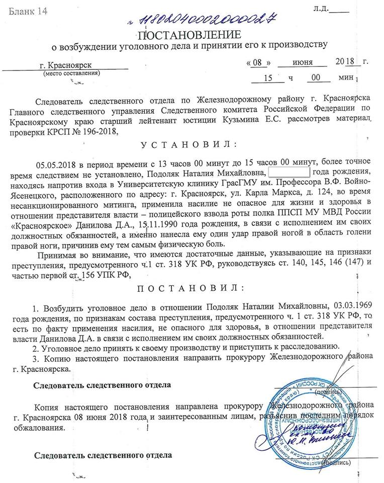 – Протокола никакого не составляли. 7 декабря ко мне приехали на работу и на парковке оперативники Центра "Э" стали задерживать, говоря, что нам нужно проехать в прокуратуру. Я спросила: "На основании чего?" Они показали документ, в котором прокуратура обращается к ним – что нужно Подоляк доставить для составления протокола в рамках какого-то расследования. Они пытались посадить меня в свою машину, я предложила им ехать в моей, один действительно сел ко мне – так и добрались. Прокурор стала задавать вопросы, а я попросила объяснить ситуацию. Она отказалась, тогда я сослалась на 51-ю статью Конституции и попросила назначить время, чтобы прийти с адвокатом. Так и сделали – мы пришли 9-го числа. Я написала заявление с просьбой ознакомить с материалами дела, потому что не понимала – за что на меня пытаются составить протокол и завести дело.