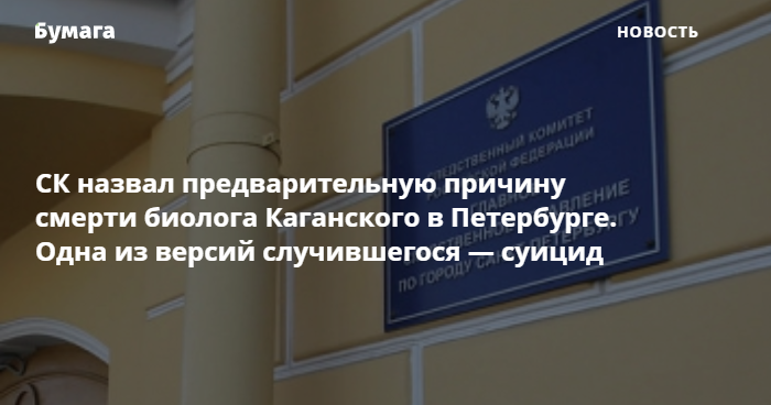 По данным ведомства, Каганский умер от травм, полученных при падении с большой высоты. Следствие рассматривает различные версии случившегося, в том числе и суицид. Сотрудники правоохранительных органов уже допросили знакомых и родственников погибшего, отмечает СК.