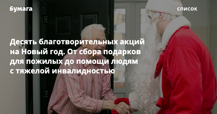 Собрать новогодние подарки для домов престарелых, исполнить мечту человека с тяжелой инвалидностью и помочь благотворительным организациям устроить праздник для подопечных. «Бумага» — собрала десять акций, участие в которых поддержит людей в хосписах, детей и животных.