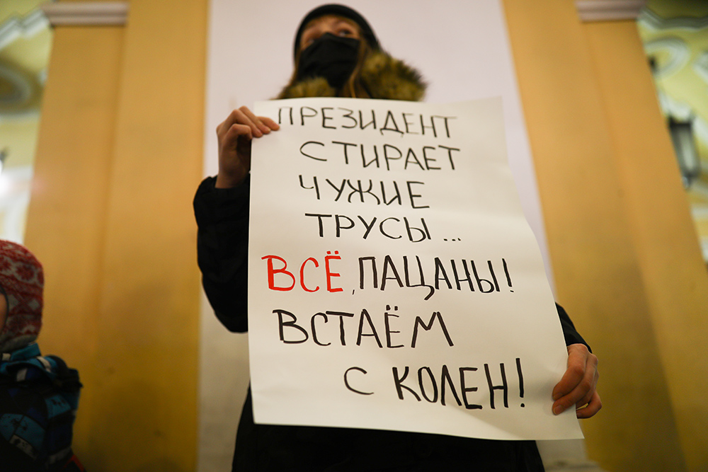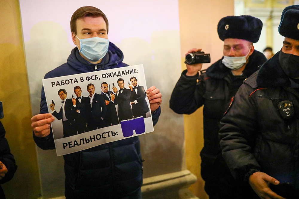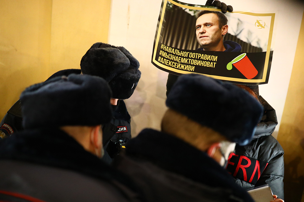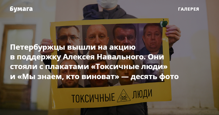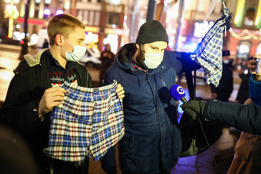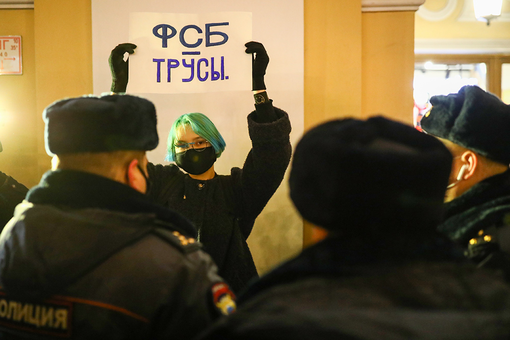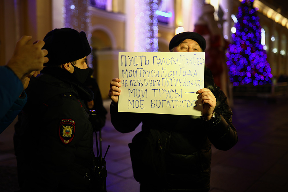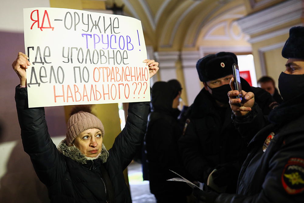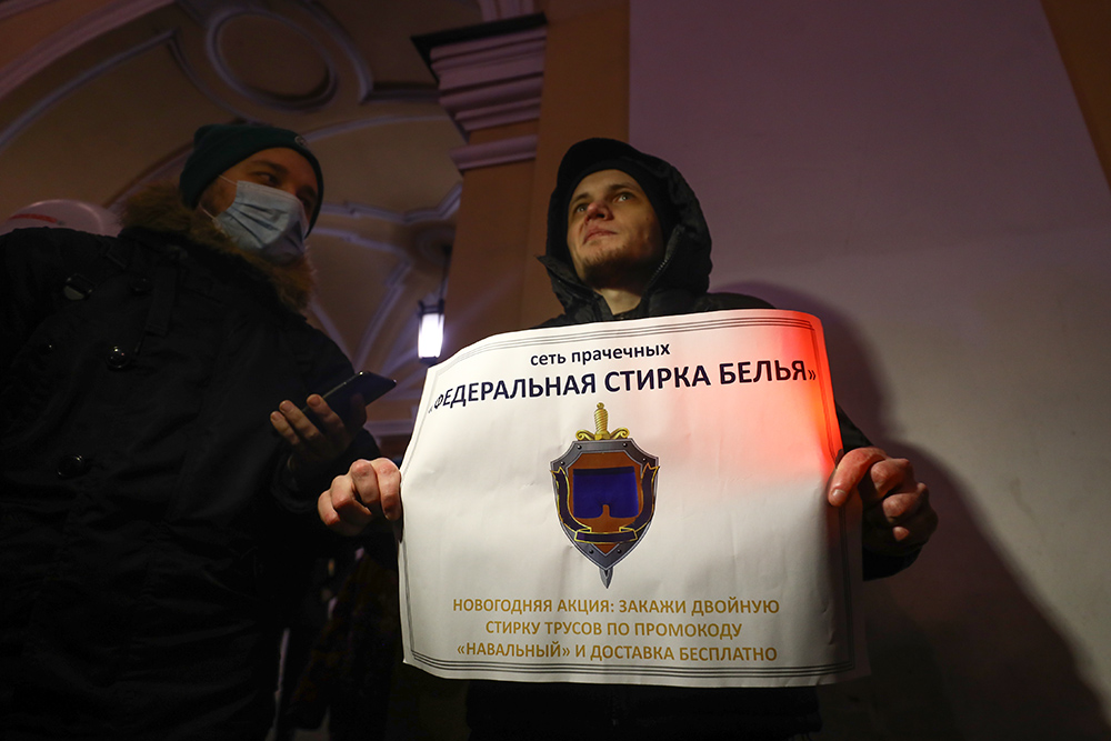 Вечером 22 декабря у Гостиного двора в Петербурге прошла акция в поддержку политика Алексея Навального. Люди стояли в пикетах с плакатами «ФСБ — трусы», «Сеть прачечных „Федеральная стирка белья“» и «Яд — оружие трусов. Где уголовное дело по отравлению Навального?».