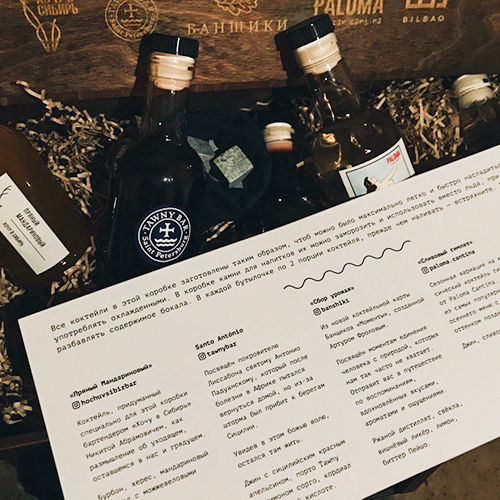 Бар на улице Восстания с пельменями ручной лепки и су-вид-коктейлями объединился с другими петербургскими заведениями — Tawny Bar, «Банщиками», Paloma Cantina и Bilbao. Участники проекта собрали новогоднюю коробку с коктейлями от каждого заведения: десять коктейлей упаковали в подарочный ящик с гравировкой.