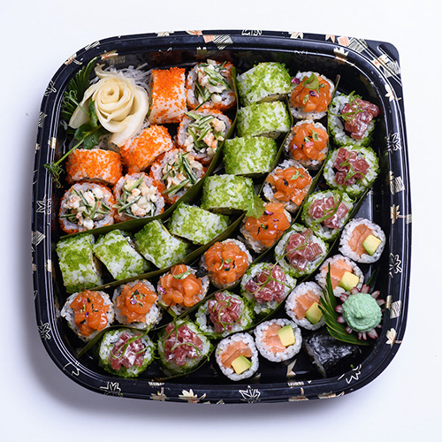 Суши-бар на Восстания, 23 составил два больших новогодних сета с роллами. В меньший включили 38 кусочков с лососем, тунцом, креветкой и другими начинками. В больший — роллы с гребешком, морским окунем, «Филадельфию» и другие позиции.