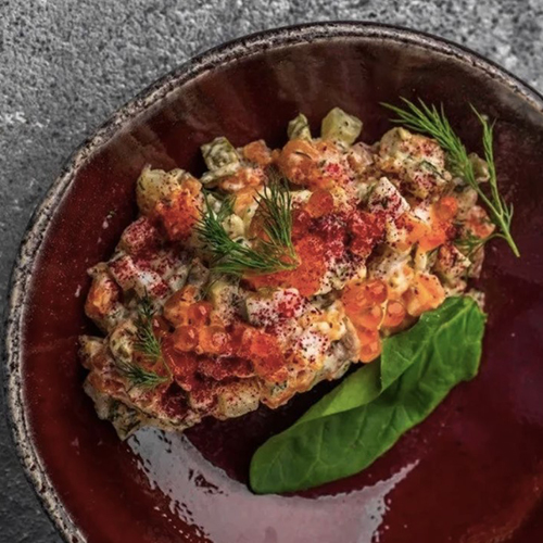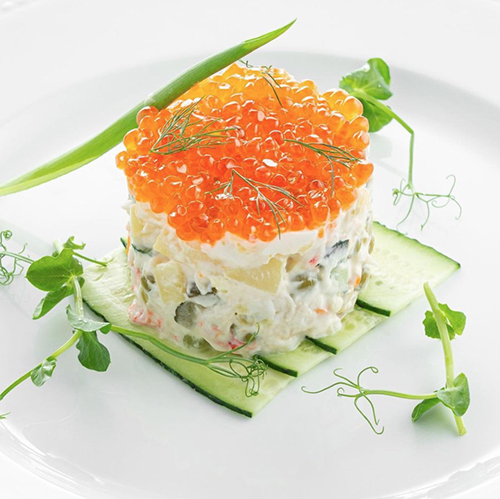 оливье с говяжьим языком и красной икрой