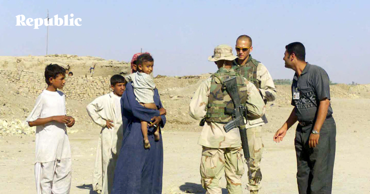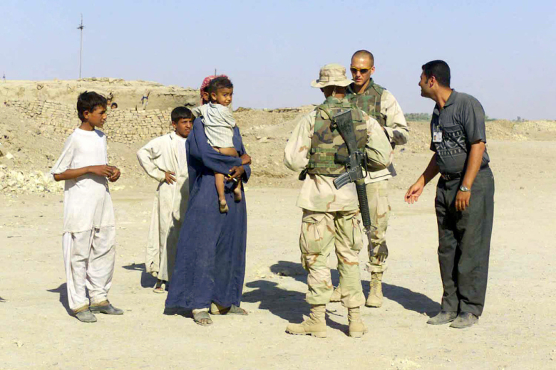 Американские солдаты в Ираке общаются с местными жителями через переводчика (справа). В ходе иракской войны переводчики-иракцы гибли в 10 раз чаще, чем военнослужащие коалиции.