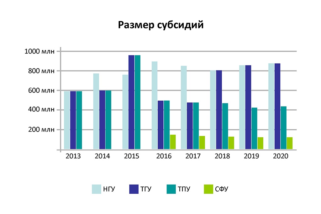 В Сибири же на втором месте по объему вложений в конкурентоспособность — ТГУ: общий размер субсидий составил около 5,7 млрд рублей, то есть в среднем по 712 млн рублей ежегодно.