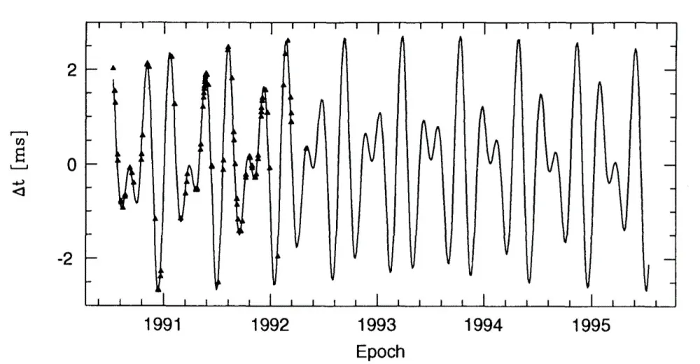 Рис. 3. Дрейф фазы (времени прибытия импульсов) PSR1257+12. Треугольники — значения, измеренные Вольщаном. Кривая — результат подгонки орбитальным движением с двумя планетами. Источник: [4]