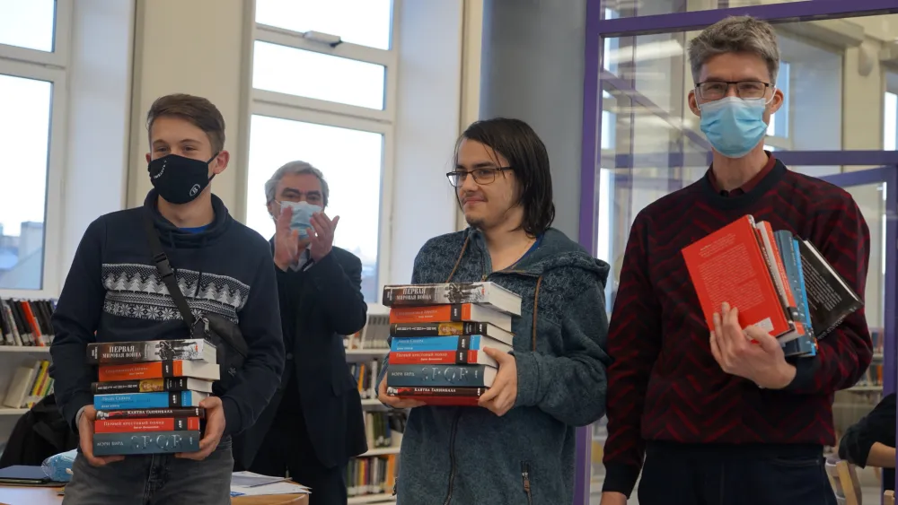 Три победителя «Исторического дня»: Никита Ерохов (студент истфака МГУ), Михаил Немцев и Илья Зайцев (студент факультета географии и геоинформационных технологий ВШЭ, выпускник гимназии 1543). Им вручили книги издательства «Альпина нон-фикшн». Фото Н. Деминой