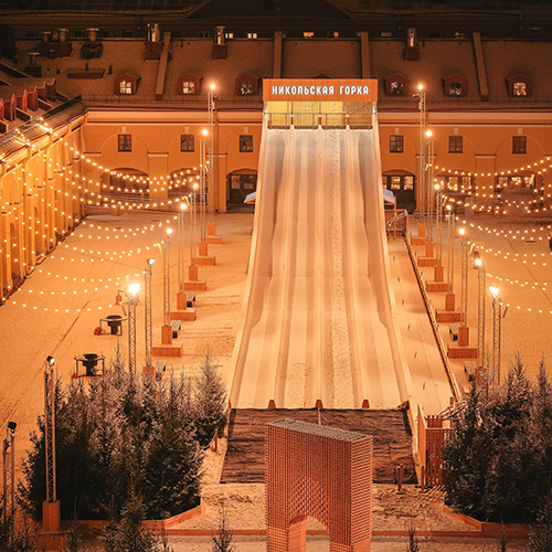 Этим летом во дворе «Никольских рядов» открыли общественное пространство с фудтраками и зоной отдыха, а теперь на площадке запустили поп-ап-проект «Зима в Никольских рядах». Во дворе установили горку для катания: в высоту она достигает 12 метров, в длину — 70. Кроме того, в пространстве поставили временную смотровую башню с видом на достопримечательности Коломны, а также открыли рождественский маркет: с игрушками, украшениями, едой и другими товарами. Организаторы соблюдают все необходимые меры безопасности — например, вход в пространство осуществляется только по временным интервалам (это позволяет следить за численностью).