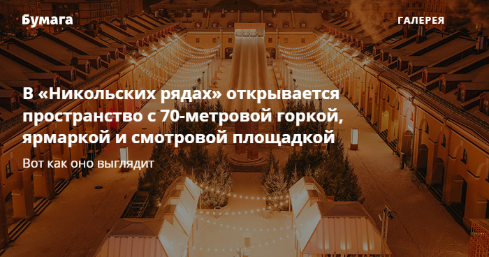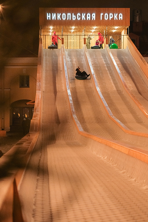 В «Никольских рядах» 23 декабря открывается зимнее пространство с рождественской ярмаркой и 70-метровой горкой. Во дворе также построили смотровую башню, с которой открывается вид на Никольский собор и Семимостье.