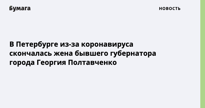 В Петербурге из-за коронавируса умерла жена бывшего губернатора города Георгия Полтавченко Екатерина Полтавченко. Об этом сообщает «Фонтанка» со ссылкой на депутата Госдумы Игоря Дивинского.