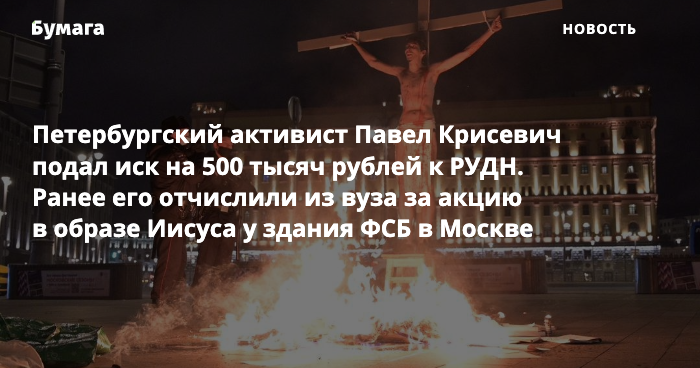 Петербургский активист и акционист Павел Крисевич подал иск в Гагаринский суд Москвы с требованием отменить приказ о его отчислении из Российского университета дружбы народов (РУДН) и выплатить компенсацию морального вреда в размере 500 тысяч рублей. Об этом сообщает телеграм-канал «Апология протеста».