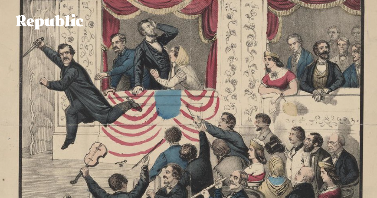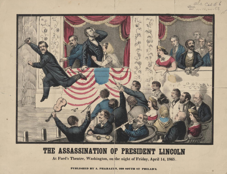 Убийство президента Линкольна 14 апреля 1865 года. Убийца Джон Уилкс Бут (слева; выпрыгивает из президентской ложи с ножом) смог сбежать с места преступления и несколько дней скрывался. Впоследствии президент Эндрю Джонсон, преемник Линкольна, помиловал сообщника Бута, который спрятал убийцу.