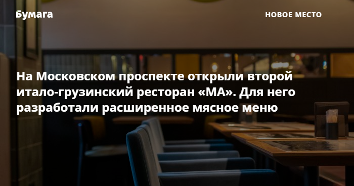 На Московском проспекте, 200 — неподалеку от Московского парка Победы — открыли второй итало-грузинский ресторан «МА», сообщили «Бумаге» представители заведения. Первый «МА» начал работу в 2019 году на улице Рубинштейна.