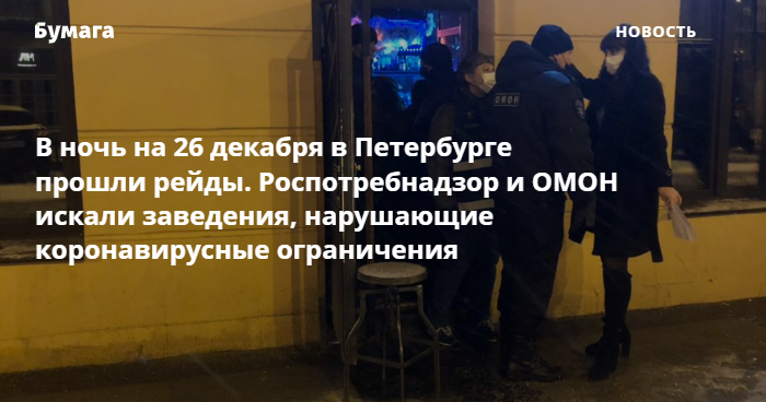 В ночь на 26 декабря в центре Петербурга прошли рейды, во время которых искали бары и рестораны, нарушающие коронавирусные ограничения. Общепиту временно запрещено принимать посетителей после 19:00.