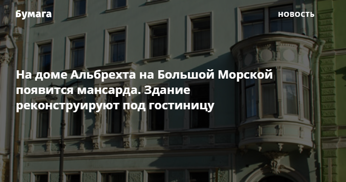 Дом Альбрехта на Большой Морской улице реконструируют под гостиницу, а на его чердаке появится мансарда. КГИОП выдал положительное заключение на проведение работ, сообщается на сайте ведомства.