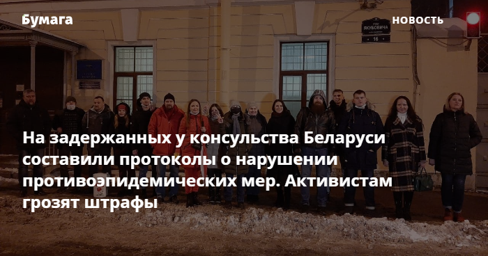 Вечером 26 декабря из отдела полиции № 1 отпустили 14 активистов, задержанных ранее у консульства Беларуси в Петербурге. На них составили протоколы о нарушении противоэпидемических мер, сообщают «Северо-Запад. МБХ медиа» и «Фонтанка».