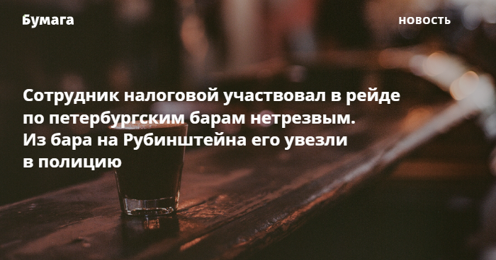 В пресс-службе МВД по Петербургу и Ленинградской области рассказали, что сотрудника налоговой доставили из бара на Рубинштейна и назначили ему административный штраф за употребление алкоголя в публичных местах. Штраф уже оплатили, отметили в пресс-службе.