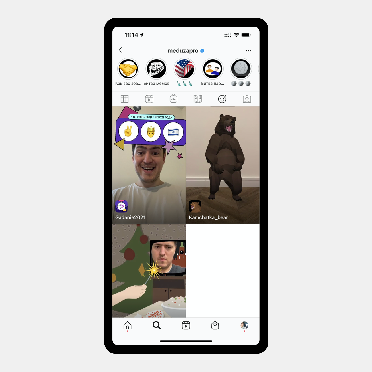Если вы читаете этот материал с телефона, просто нажмите на эту ссылку: откроется окно в браузере, которое предложит перейти в инстаграм и попробовать маску. А если вы читаете с компьютера, просто заходите с телефона в аккаунт «Медузы» в инстаграме: @meduzapro, затем переходите там во вкладку с масками и нажимайте на ту, что называется Gadanie2021.