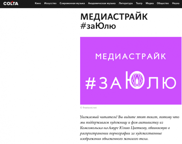 Акции в поддержку российской художницы и активистки Юлии Цветковой, обвиняемой в ЛГБТ-пропаганде и распространении порнографии, также носили гибридный формат. Они одновременно проходили в офлайне в виде одиночных пикетов и массовой поддержки во время судебных заседаний. Также сопровождались постами в социальных сетях и медиастрайком, в ходе которого многие медиа выразили поддержку художнице и отказались от постов.