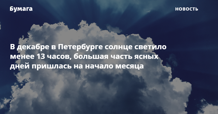 Для сравнения: в декабре 2018-го продолжительность солнечного сияния в Петербурге составила 1,4 часа, а в 2019-м — 2,5 часа.