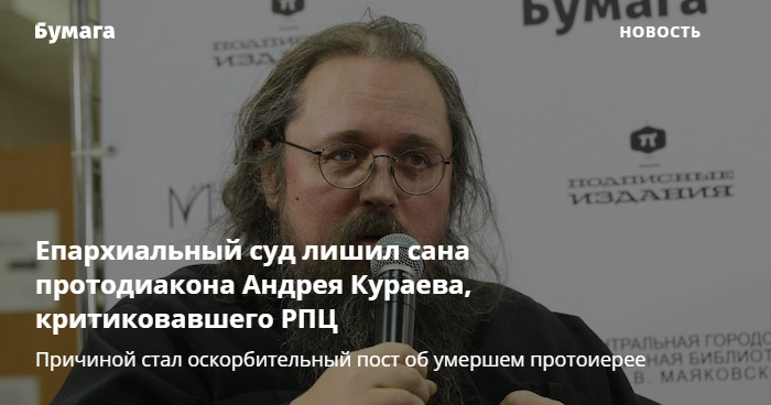 Суд Московской городской епархии лишил сана протодиакона Андрея Кураева. Об этом сообщили на епархиальном сайте.