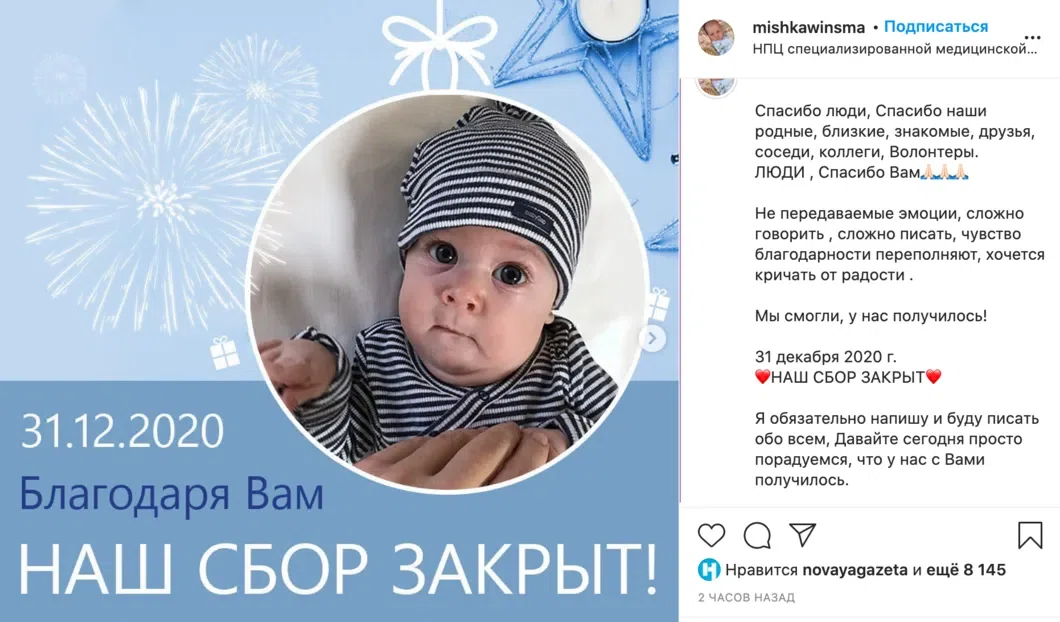 Пятимесячному ребенку Мише Бахтину из Екатеринбурга успели до Нового года собрать деньги на лекарство от спинальной мышечной атрофии (СМА) — препарат «Золгенсма», который стоит 150 млн рублей.