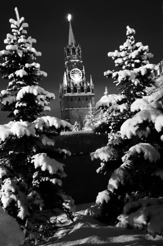 Вид на Спасскую башню Московского Кремля в новогоднюю ночь. Фото 1961 года. И. Арефьев / РИА Новости