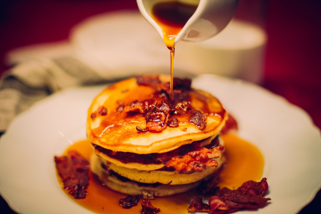 Теперь жарьте блинчики и складывайте их в аккуратную стопочку, проливая каждый слой примерно чайной ложкой сиропа и растопленным маслом и перекладывая беконом. Как закончится тесто для блинчиков — так и готово. Полейте стопку еще раз сверху сиропом и объедайтесь. Можно есть по одному, а можно, как американцы, резать всю стопку сверху вниз, как блинный пирог!