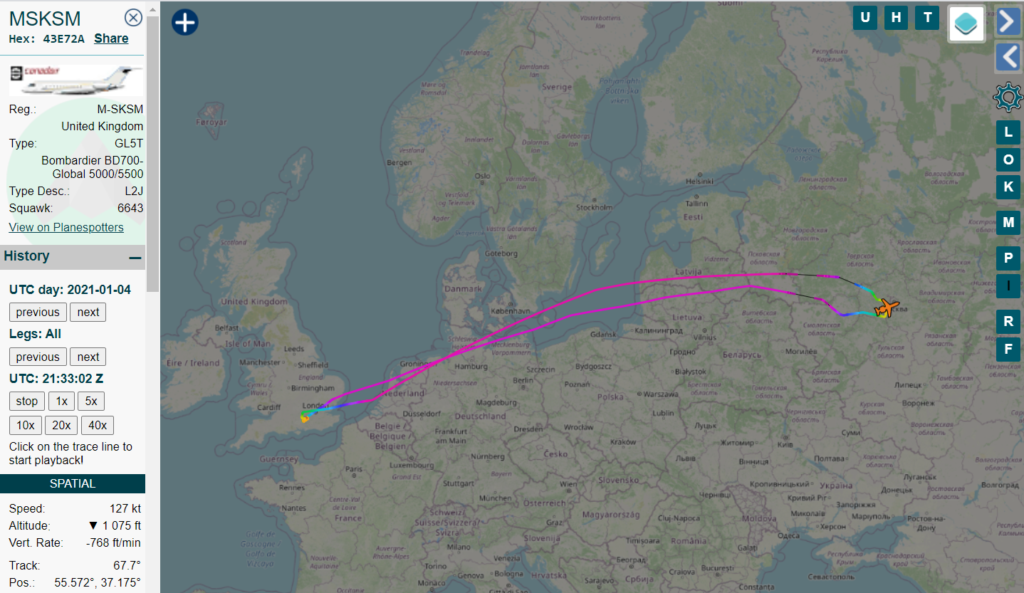Согласно информации сервиса, бизнес-джет вылетел из московского аэропорта Внуково в 17:23 (мск) четвертого января и приземлился в аэропорту Фарнборо в 20:50. Всего через 26 минут самолет вылетел обратно и вернулся в Москву в 00:32 пятого января.