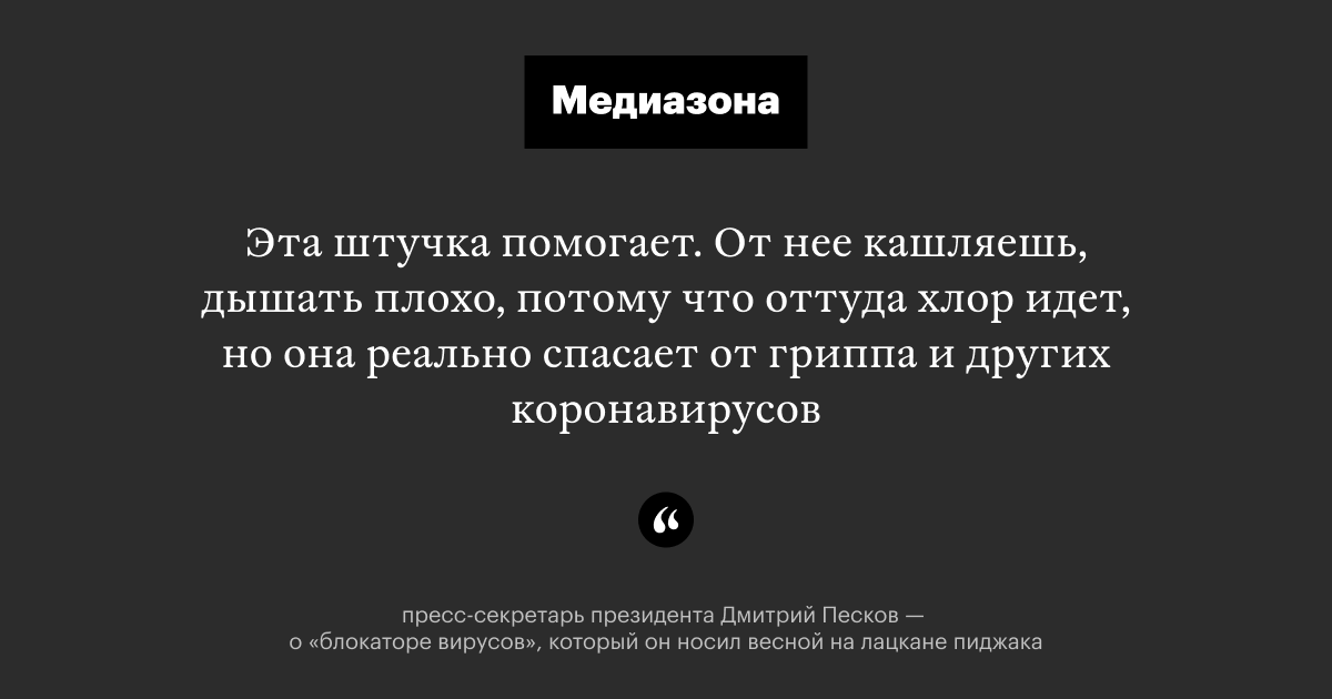 «Пока я носил эту штучку, я не болел. Но потом я был подвергнут остракизму СМИ и ее снял. И в течение нескольких недель я заболел.Эта штучка, кстати, помогает. От нее кашляешь, дышать плохо, потому что оттуда хлор идет, но она реально спасает от гриппа и других коронавирусов», — рассказал пресс-секретарь президента Дмитрий Песков в интервью телеведущему Владимиру Соловьеву.