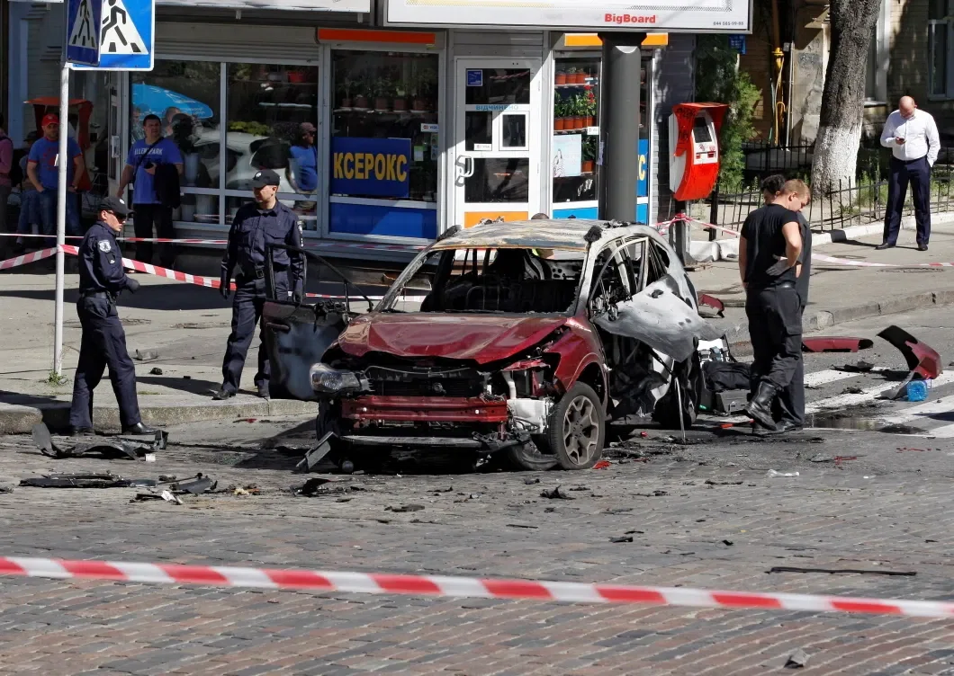 Автомобиль после взрыва бомбы. За рулем был журналист Павел Шеремет. Фото: Getty