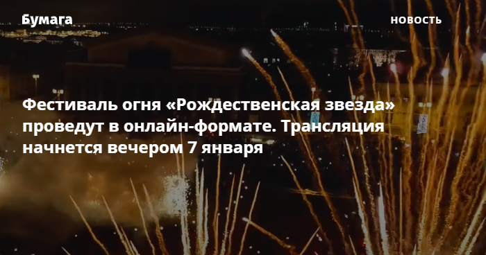В 2021 году традиционный петербургский фестиваль огня «Рождественская звезда» проведут в онлайн-формате, сообщает комитет по развитию туризма. Шоу пройдет на пяти площадках в центре города, конкретные локации не разглашаются.