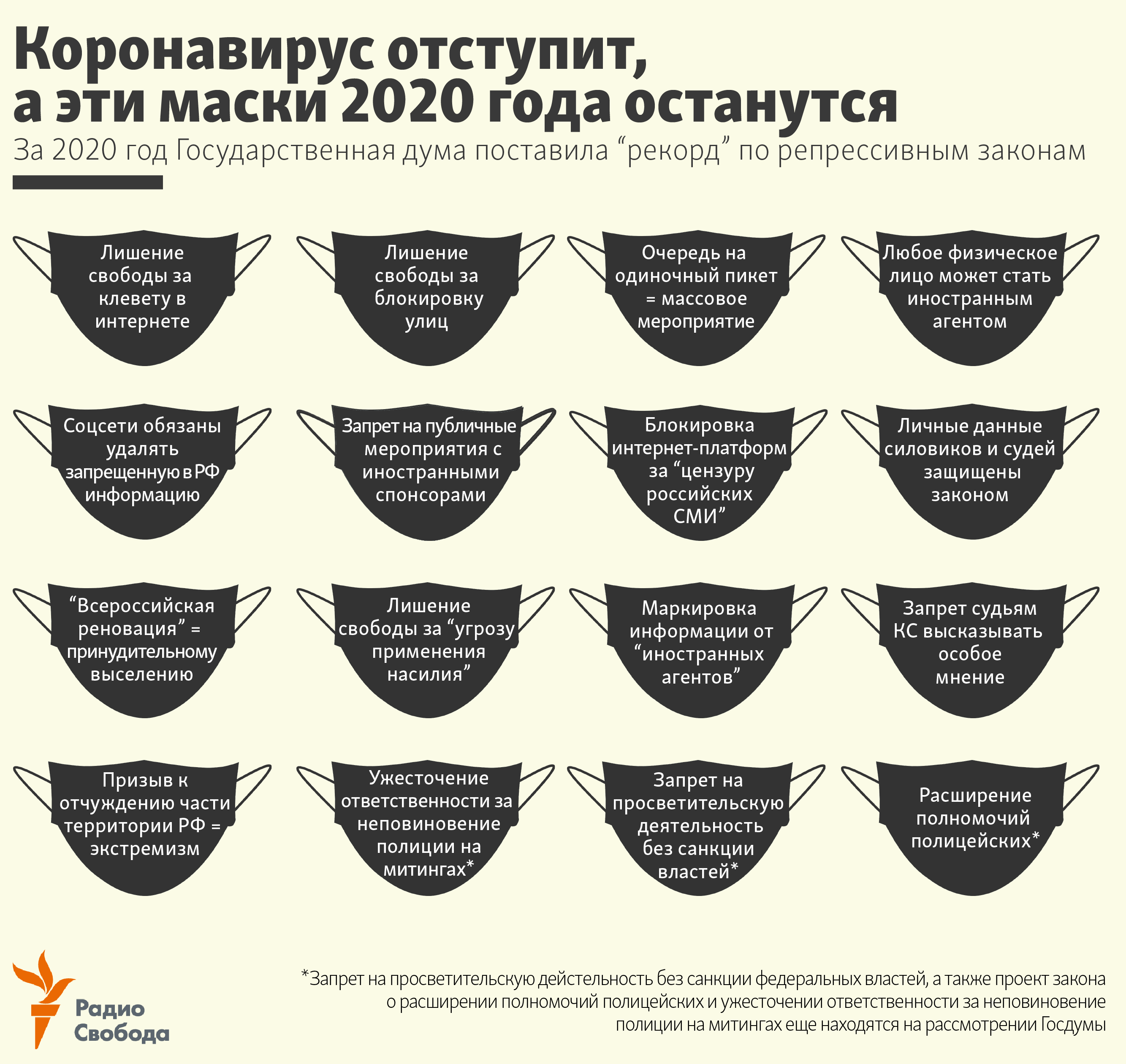 Российским властям и активистам в 2020 году не удалось найти компромисс в вопросе проведения акций протеста в период антивирусных ограничений. В конце года федеральное законодательство о митингах и вовсе ужесточили.