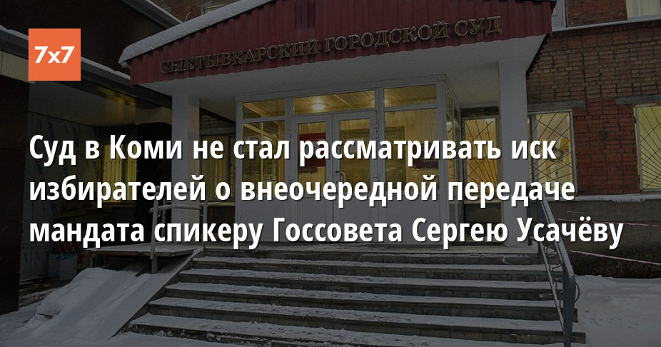 Сыктывкарский городской суд не принял коллективный иск жителей Коми, в котором они потребовали признать незаконной передачу мандата депутата Госсовета его нынешнему спикеру Сергею Усачёву. Истцы считают, что «Единая Россия» нарушила их избирательные права, передав освободившийся мандат вне очереди и пропустив более 20 претендентов, имевших приоритетное право на депутатское кресло по партийному списку. Об этом «7х7» сообщил один из истцов, юрист Виктор Воробьёв.