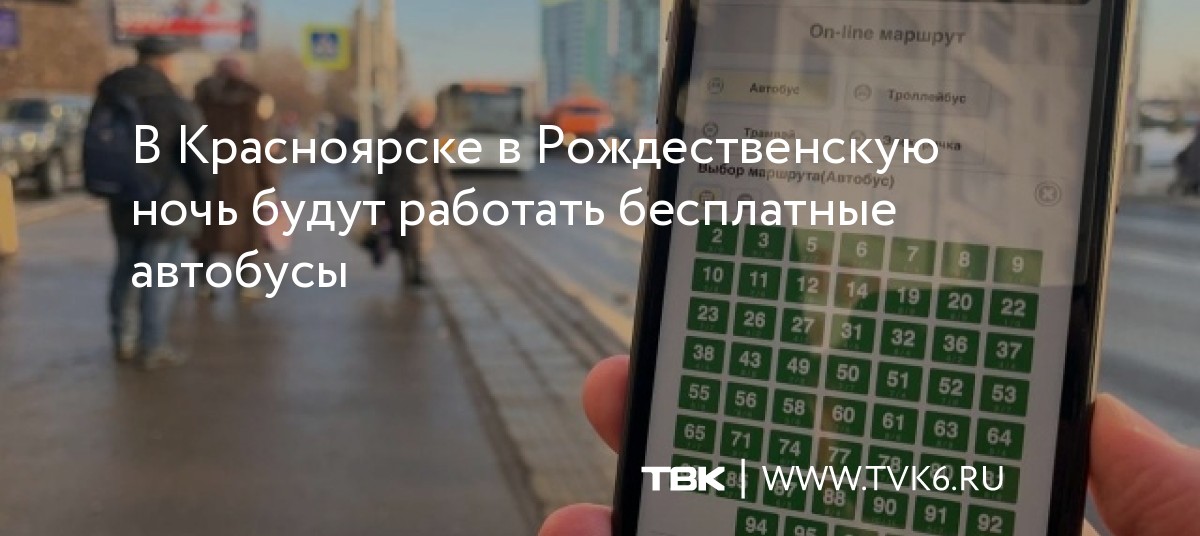 Дата06.01.2021АвторСкрытИсточникТВК-6Сохранённая копияInternet ArchiveOriginal MaterialShow translationВ Красноярске в Рождественскую ночь будут работать бесплатные автобусы В ночь с 6 на 7 января по городу будут ходить бесплатные автобусы. Маршруты будут отправляться от храмов в 2:45.