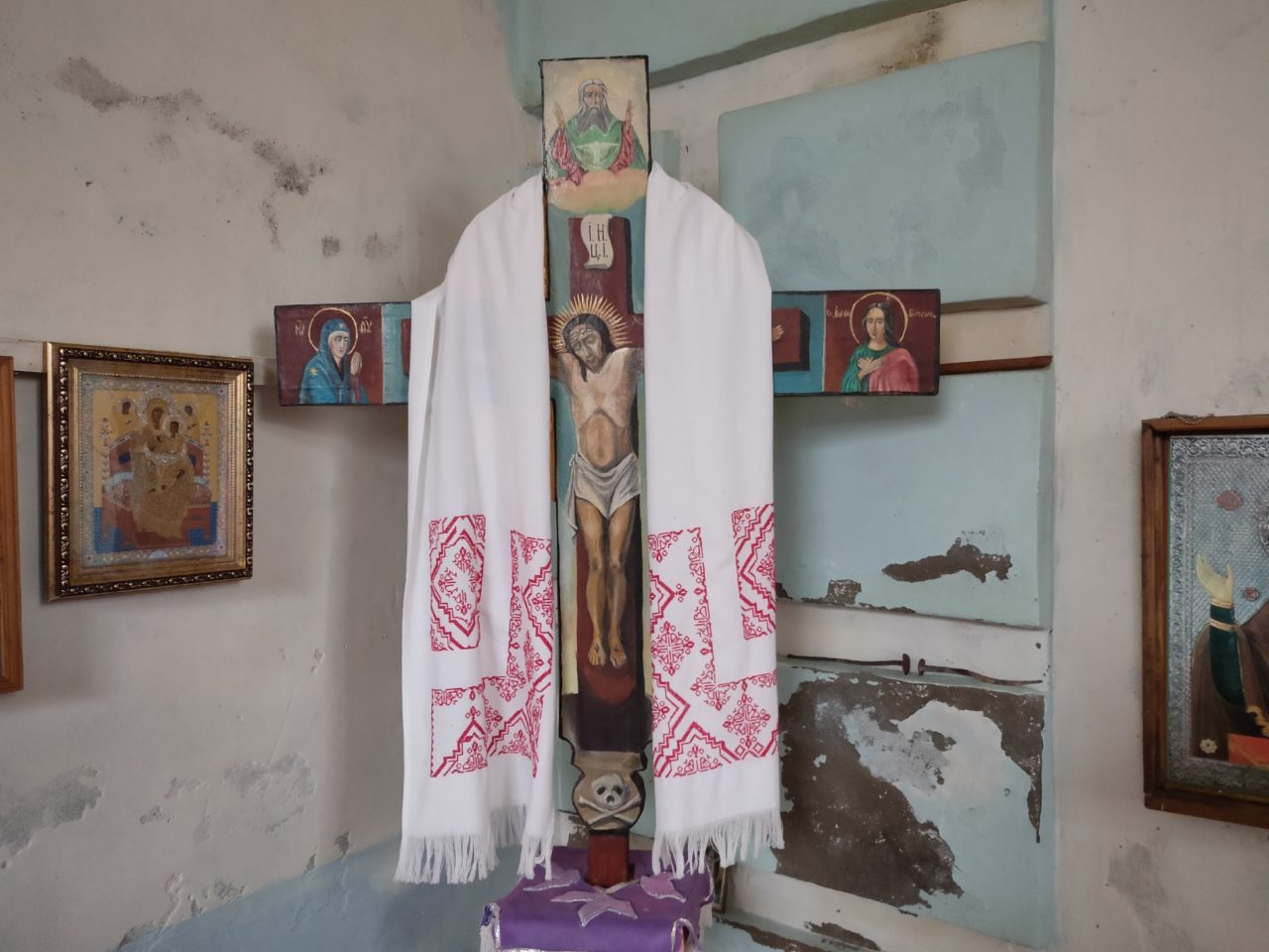 В обновленном храме есть еще шелкографическая икона Николая Угодника, которого здесь любя называют Николой Колхозным (образ купили на пожертвования жителей) и хоругви с восточным орнаментом: ткань прислала землячка, которая давно переехала в Узбекистан.